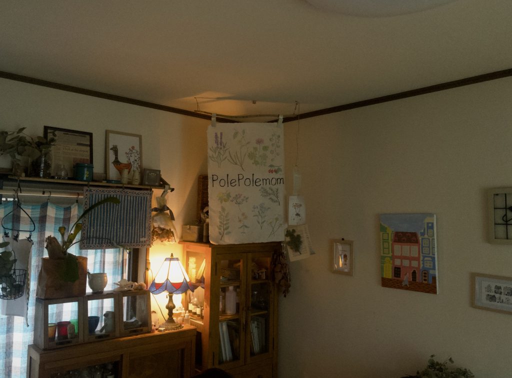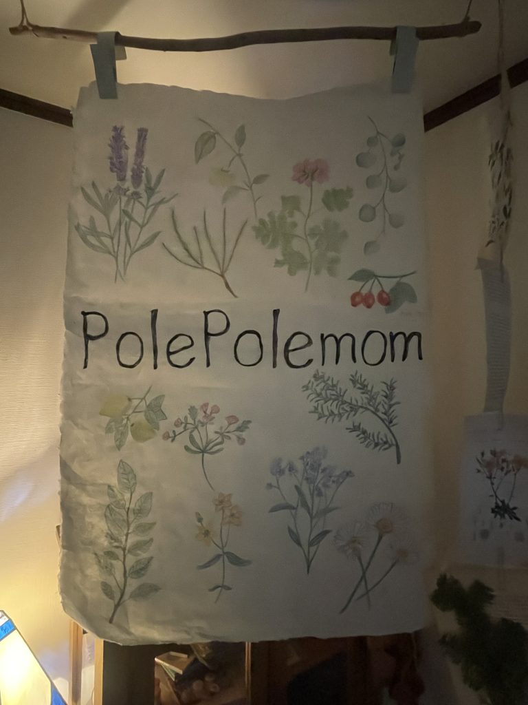 大学の春休みで帰って来ている三女に私の癒しの場所『ハクトヤ』で購入した和紙を使ってpolepolemomのタペストリーを描いてもらいました。